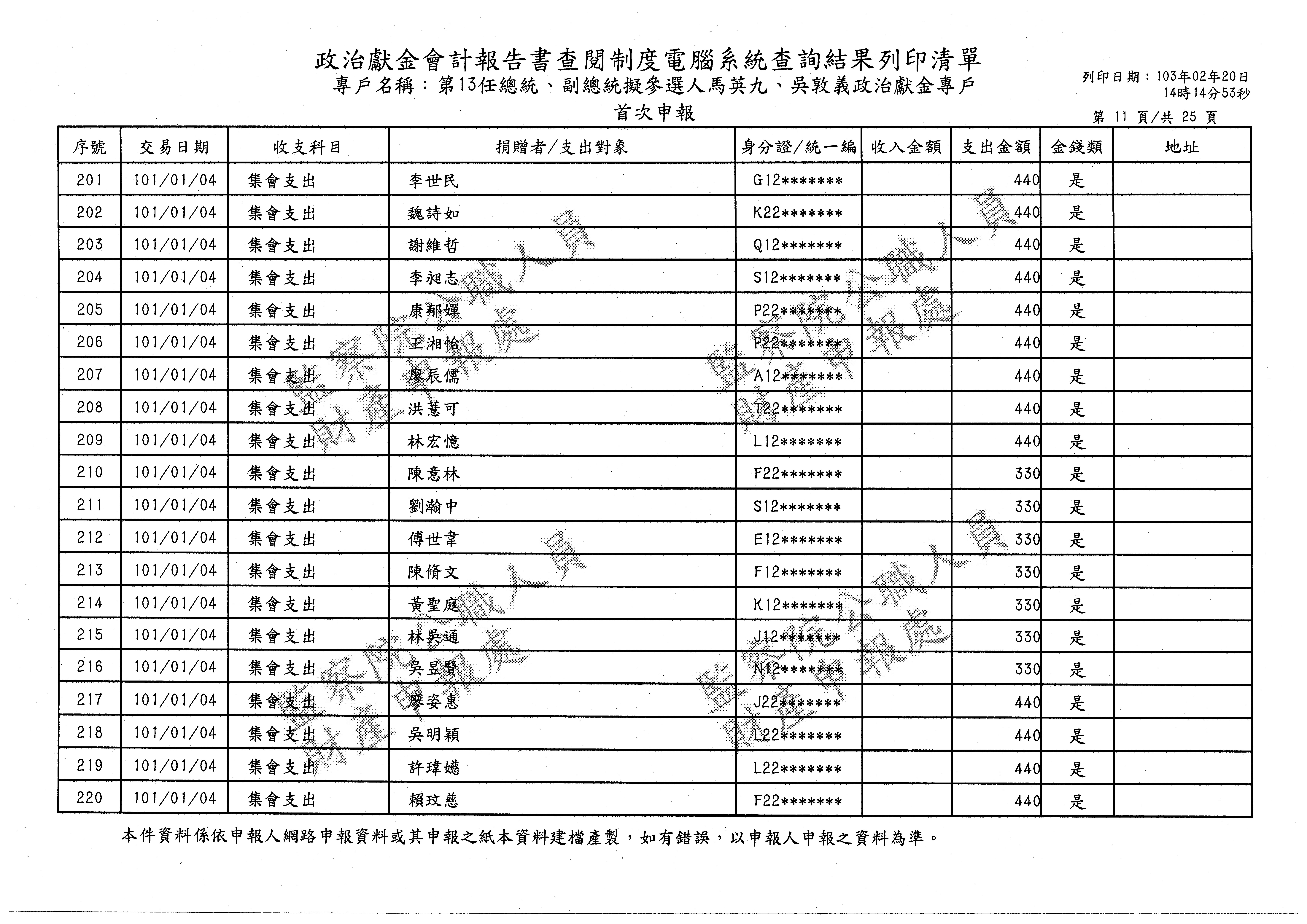 檔案名稱: 第13任總統、副總統擬參選人馬英九、吳敦義政治獻金專戶-集會支出-???/??/??-???/?/??